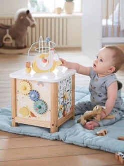 Un cube d’activités en bois taille XL qui ne manque pas d’idées pour éveiller et émerveiller bébé ! 5 faces plus intrigantes les unes que les autres, avec sur le haut du cube, un boulier et ses 2 circuits de perles, qui peut se retourner pour fermer la boite. Sur les 4 faces : une face engrenages, une face animaux à encastrer, une face « musique » avec un bouton à tirer et une roulette avec grelots à l’intérieur, et une face avec des palets à déplacer ! Ce grand cube d’activités promet de jolies découvertes à votre bébé !