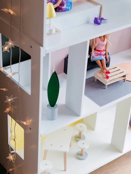 Une superbe maison au design moderne et aux dimensions adaptées aux poupées mannequin. Chambre, salon, salle à manger, votre enfant passera des heures à inventer une petite vie à ses poupées, grâce aux nombreux accessoires qui meublent la demeure.