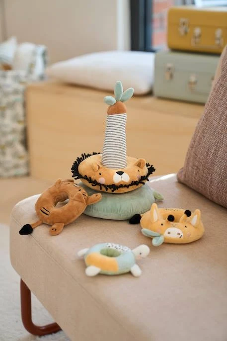 - 4 anneaux animaux de tailles différentes à empiler : un lion, une girafe, un tigre et une tortue